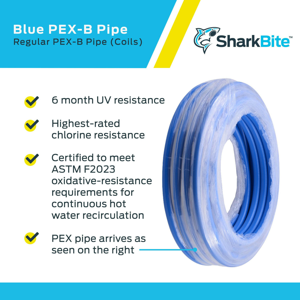 SharkBite PEX Pipe ist ein vernetzter Polyethylenschlauch, der für eine Vielzahl von privaten und gewerblichen Sanitäranwendungen entwickelt wurde. Hergestellt ohne Sauerstoffbarriere für Trinkwassersysteme (erhältlich in Weiß, Blau und Rot). Das sich wiederholende SharkBite-Prägungsmuster bietet eine visuelle Hilfe, um festzustellen, ob der Schlauch vollständig in das SharkBite Push-Fit-Fitting eingeführt wurde. Diese Funktion funktioniert nur, wenn der Schlauch zwischen dem SharkBite-Aufdruckmuster geschnitten wird. Erhältlich in Spulen mit einer Länge von bis zu 1.000 Fuß, was längere Strecken und weniger Verbindungen ermöglicht und so Kosten, Zeit und potenzielle Leckstellen reduziert.