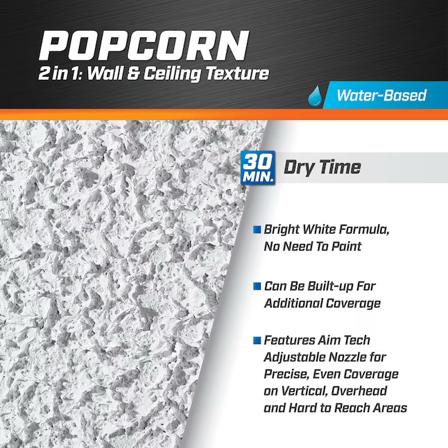 Die wasserbasierte Popcorn-Wand- und Deckentextur für den Innen- und Außenbereich ist geruchsarm und lässt sich leicht mit Wasser reinigen