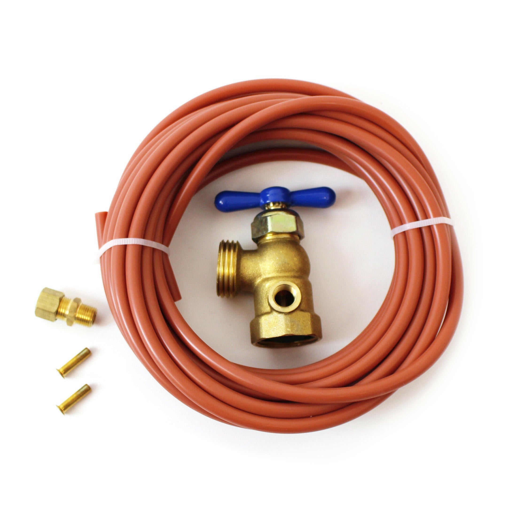 - Enthält ¼ Zoll 25 Fuß. Kupferpolyrohr, Messingschwellenhahn, Gartenschlauchgewinde x ⅛" FPT mit seitlichem Gewinde, Schlauchscheibe, ¼" cc x ⅛" MPT-Außengewinde, ¼" Polyrohradapter (2) und Anleitung