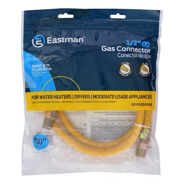 - Specifications Einlassanschlussgröße (Zoll) 1/2 Größe - Länge 60 Zoll Auslassanschlussgröße (Zoll) 1/2 BTU-Bewertung 53200 Auslassanschluss-Endtyp MIP Hohe Effizienz NEIN Paketmenge 1 Einlassanschluss-Endtyp MIP Verwenden Gasanschluss Material Edelstahl Arbeitstemperaturbereich -20 bis 150 Grad F Maximaler PSI 0,5