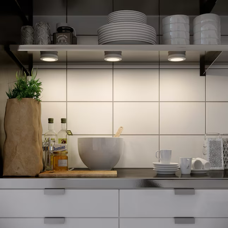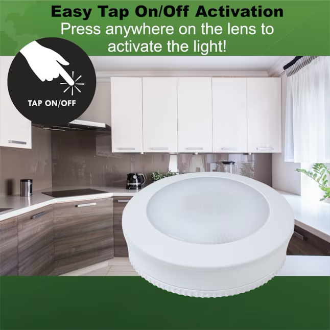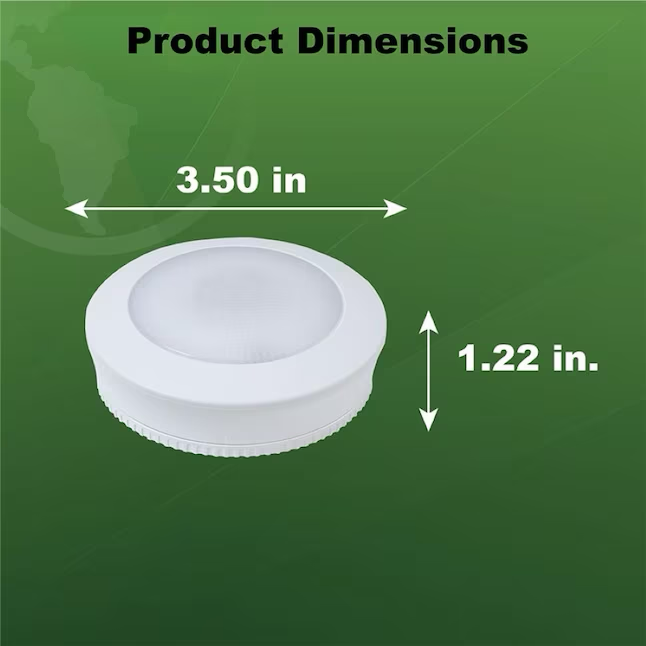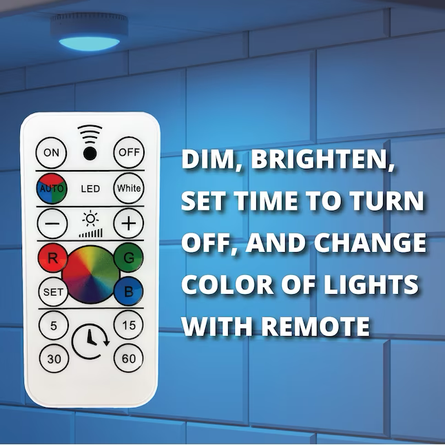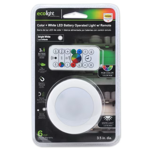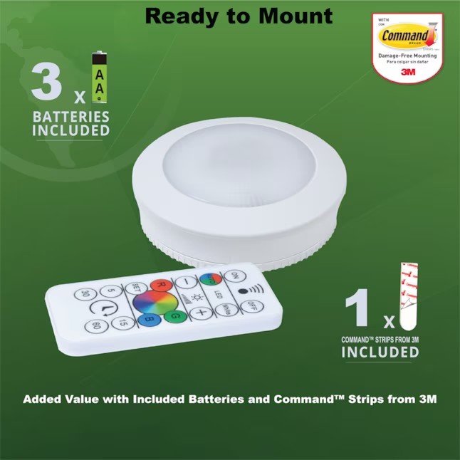 Enthält (1) LED-Puck-Licht, (3) AA-Batterien, (1) Fernbedienung, (1) Command™ Medium Nachfüllstreifen und (1) Schraube