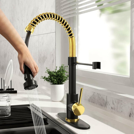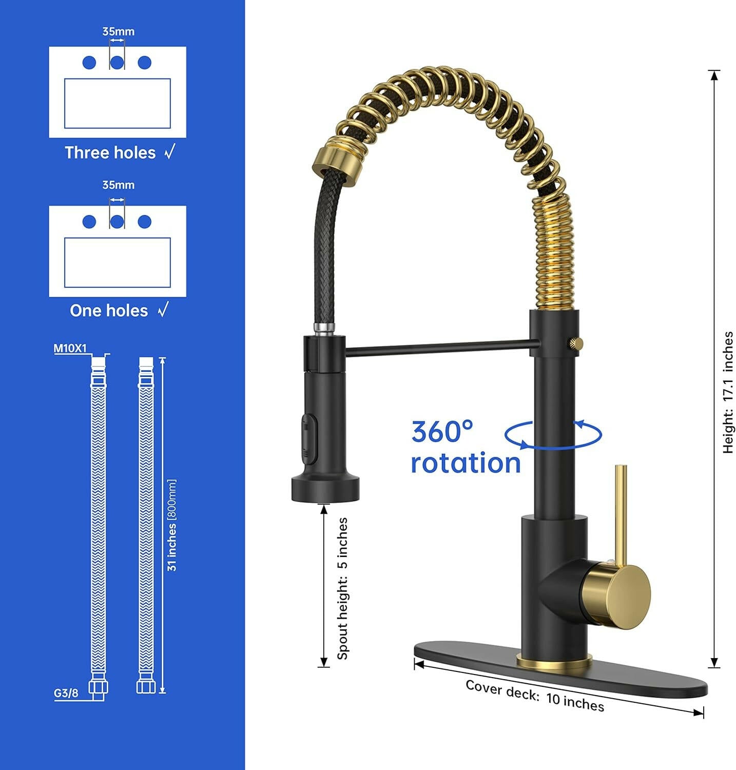 Der schwarzgoldene Küchenspülenhahn besteht aus einer Feder aus Edelstahl 304. Der innere Keramikventilkern ist langlebig und verhindert Wasserlecks. Wir wählen die Materialien sorgfältig aus, um die Sicherheit von Ihnen und Ihrer Familie zu gewährleisten.