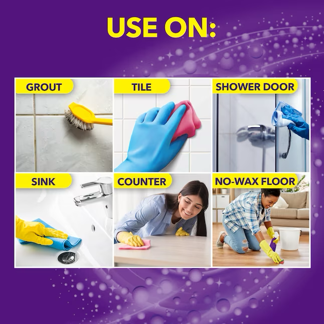 Reinigt Seifen-, Schaum-, Schimmel- und Stockflecken von Badezimmer- und Haushaltsoberflächen wie Fugen, Fliesen, Badewannen, Duschtüren, Vinyl-Duschvorhängen, Waschbecken, Theken und sogar von Böden ohne Wachs.