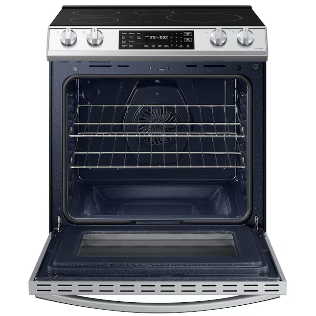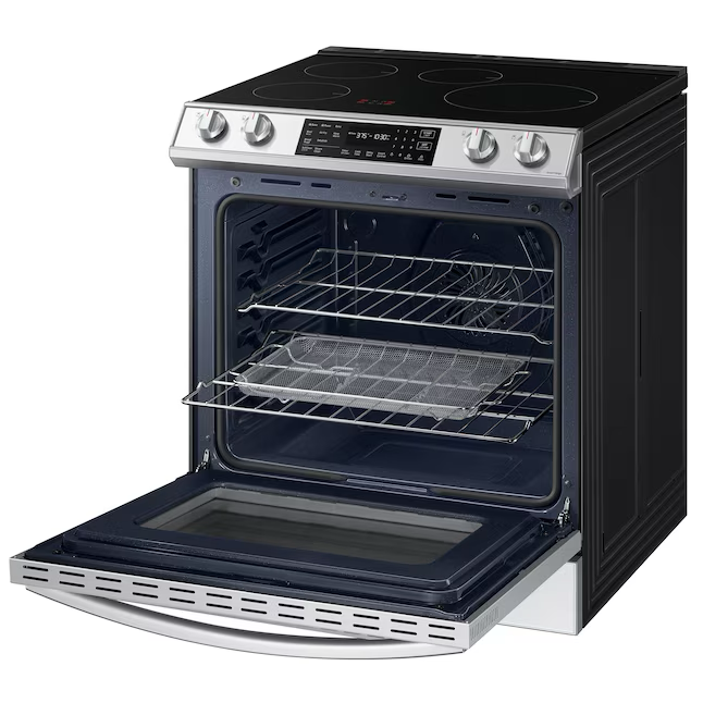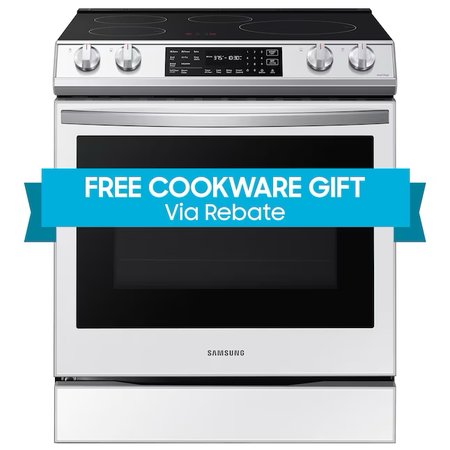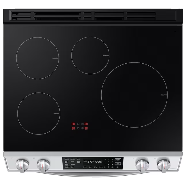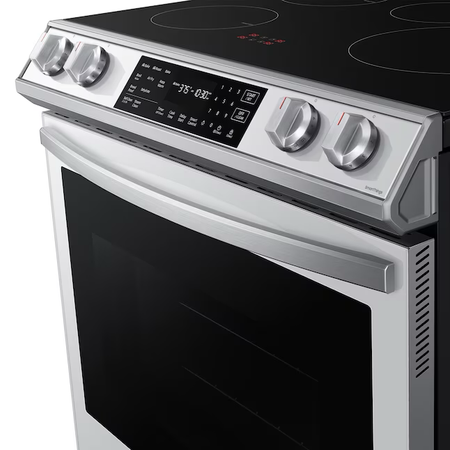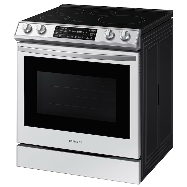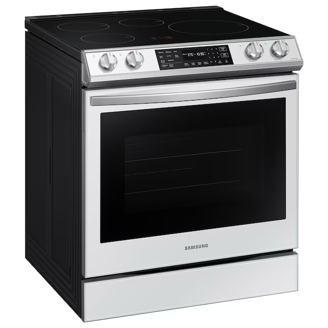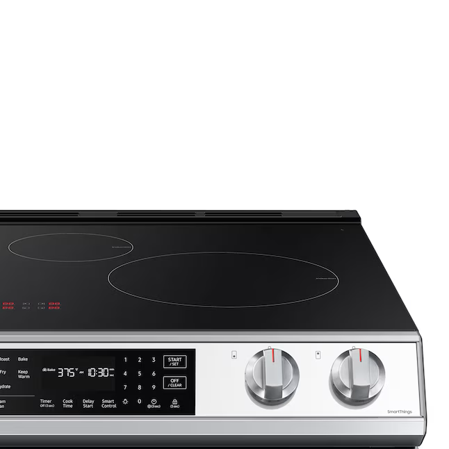 Samsung Bespoke Rapid Heat Induction 30 Zoll 4 Brenner 6,3 Kubikfuß Selbst- und Dampfreinigender Air Fry-Konvektionsofen Einschub-Smart-Induktionsherd (weißes Glas)