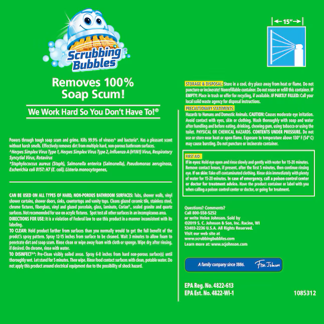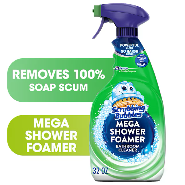 Scrubbing Bubbles Mega Shower Foamer Aerosol hat eine schäumende, schmutzlösende Formel und eine breite Sprühdüse.