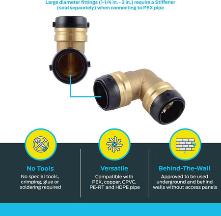 - Fittings mit großem Durchmesser (1-1/4 Zoll - 2 Zoll) erfordern beim Anschluss an PEX-Rohre eine Versteifung (separat erhältlich).