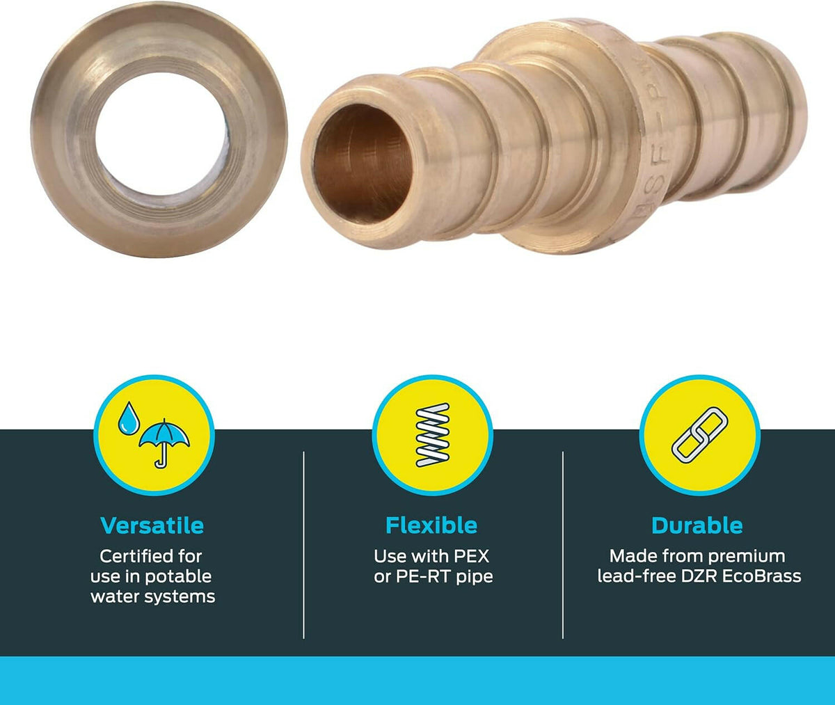 Verbinden Sie zwei gleich große PEX-Rohrstücke mithilfe von Crimp- oder Klemmringen miteinander. Zertifiziert für den Einsatz in Trinkwasser- und Wasserheizsystemen.