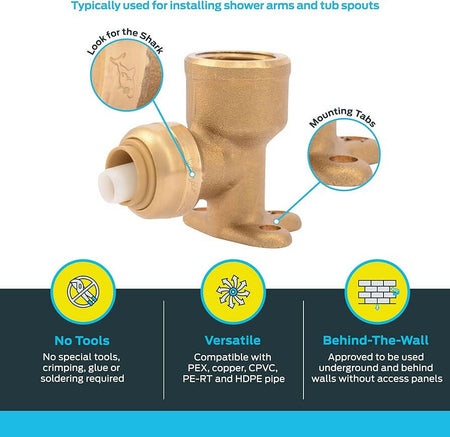 Stellen Sie eine 90°-Verbindung und einen Übergang zu einem Gewinderohr her. Verfügt über Befestigungsösen mit Löchern zur Befestigung an einer Unterlage. Wird normalerweise für die Installation von Duscharmen und Wanneneinläufen verwendet. Das innovative Push-to-Connect-Design sorgt für eine schnelle und einfache Installation. Ideal für Arbeiten in engen Räumen. Die kürzere Installationszeit und die Benutzerfreundlichkeit reduzieren Installationsfehler.