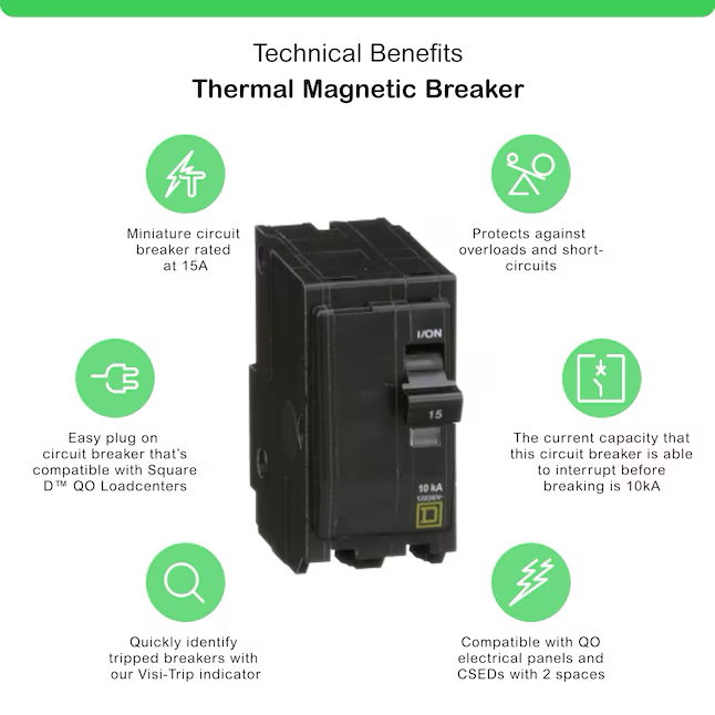 Der zweipolige Leistungsschalter QO 15 Amp enthält einen thermomagnetischen Auslösemechanismus und verfügt über eine zweipolige gemeinsame Auslösung. Der Leistungsschalter verfügt über eine sichtbare Auslöseanzeige, mit der der ausgelöste Stromkreis im Lastzentrum leicht identifiziert werden kann.