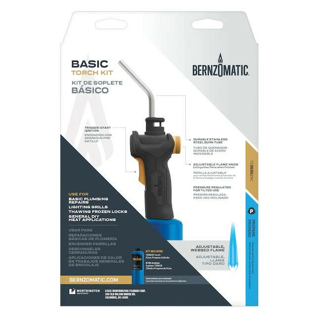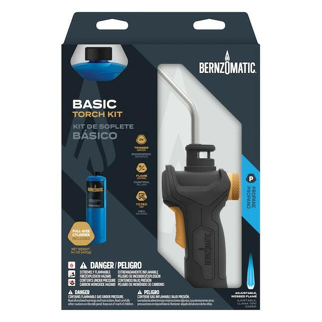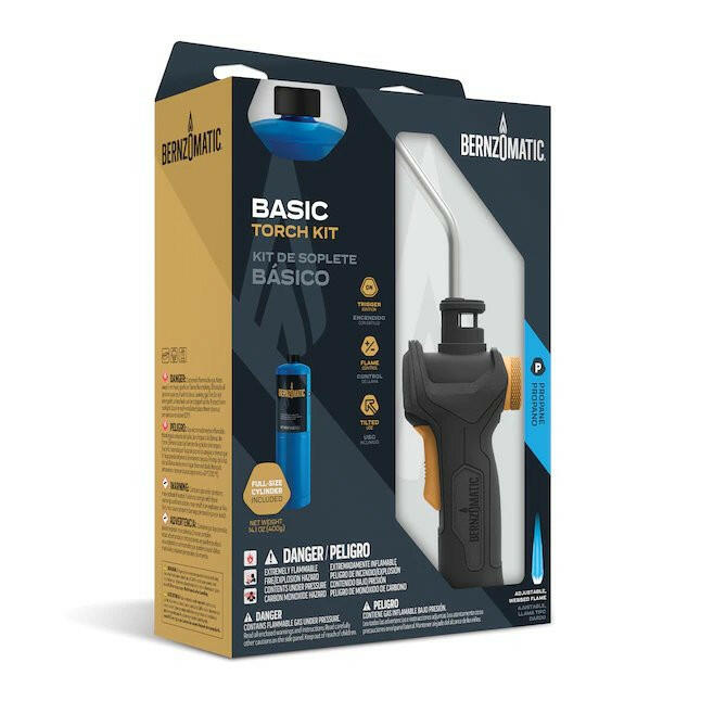 The Bernzomatic® Basic Torch Kit includes one Basic Torch and one 14.1 oz Bernzomatic Propane cylinder. The Basic Torch offers an adjustable, webbed flame and hassle-free, trigger-start ignition. It is equipped with an ergonomic grip and a pressure regulator, allowing for tilted use. This torch works best for regular household repairs and DIY projects, thawing and melting, small diameter soldering, woodworking and lighting grills. Limited 3-Year Warranty.