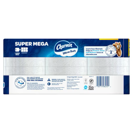 Pack contains 12 Super Mega Rolls (336 Sheets Per Roll) of Charmin Ultra Soft Toilet Paper