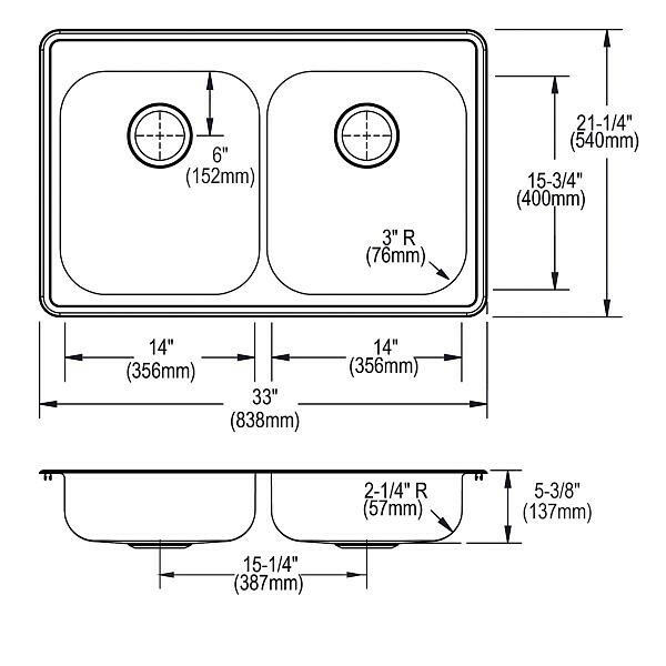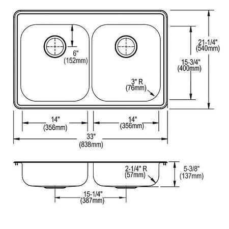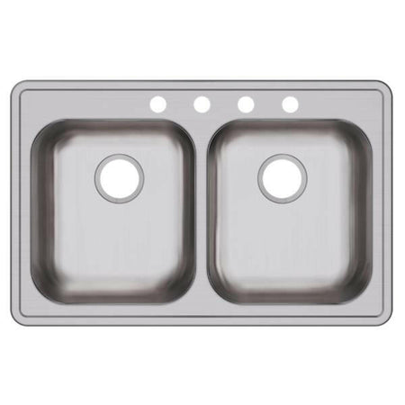 Dayton Stainless Steel 33" x 21-1/4" x 5-3/8" 4-Hole Equal Double Bowl Drop-in Sink