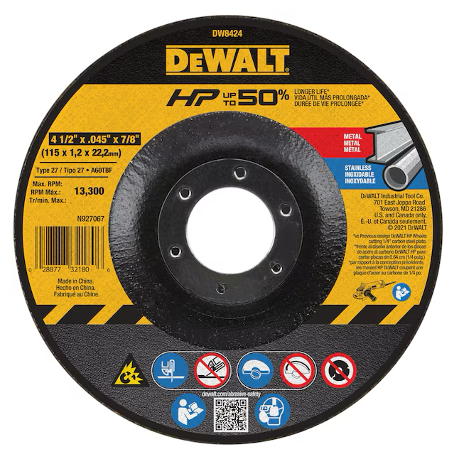 - Specifications Application Cutting For Use with Ferrous Metal Yes For Use with Aluminum No For Use with Stainless Steel Yes For Use with Angle Grinders Yes For Use with Tile No For Use with Asphalt No Grit N/A For Use with Chop Saws No Material Aluminum oxide For Use with Circular Saws No Package Quantity 1 For Use with Concrete & Masonry No Threads Per Inch 0 For Use with Cut-Off Saws No Wheel Type Cut-off wheel For Use with Ductile Pipe No