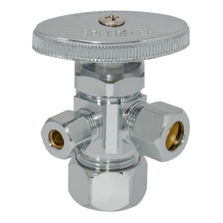 The Eastman® Speed-flex® 3-way shut-off valve is a multi-valve that resists corrosion and provides a water-tight seal. This stop valve has a 5/8-inch outer diameter compression inlet x dual-outlet connection: 3/8-inch outer diameter compression outlet x 1/4 outer diameter compression outlet. It is a professional series valve with a solid brass body and solid brass nuts, chrome-plated finish.