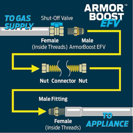 Includes: 48-IN gas connector, ArmorBoost EFV valve, fittings, thread sealant, and leak detector