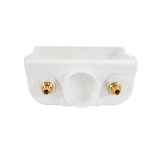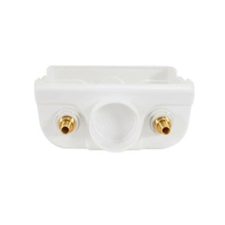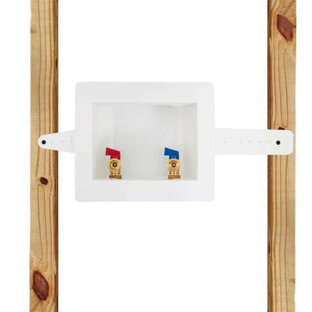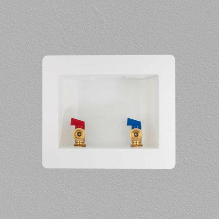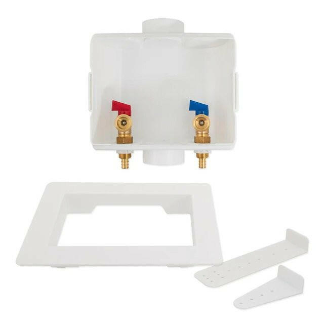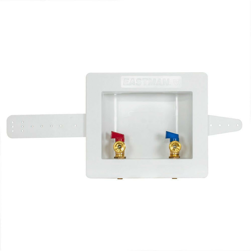 The Eastman® center drain washing machine outlet box provides a safe water supply installation for washing machines. It is a one-piece box built with high-impact non-corrosive plastic and a center drain. It has a recessed design that accommodates 1-inch drywall. It comes with a pre-installed support bracket, a faceplate cover and 1/4-turn hot and cold ball valves for shut-off during maintenance. This washing machine outlet box has a 1/2-inch Crimp PEX inlet connection and a 3/4-inch male hose thread outlet. It is designed for residential applications. UPC approved.