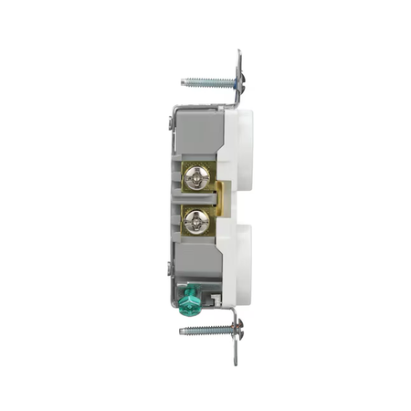 Screw-catch feature on duplex receptacle speeds mounting of wall plates