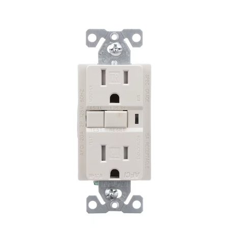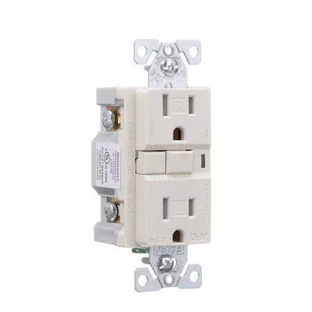• Light almond finish AF/GF receptacle offers 15A, 125V capacity for combination electric shock and arc fault protection