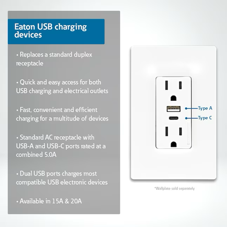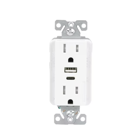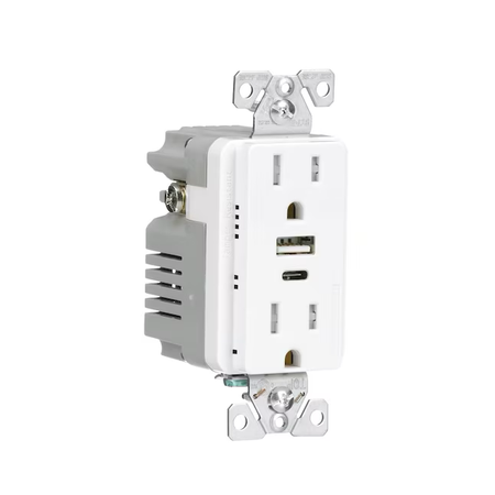 Standard duplex AC receptacle with one type A and one type C USB charging port (5A, 5V for convenient charging of most electronic accessories that charge via 5V power adapter