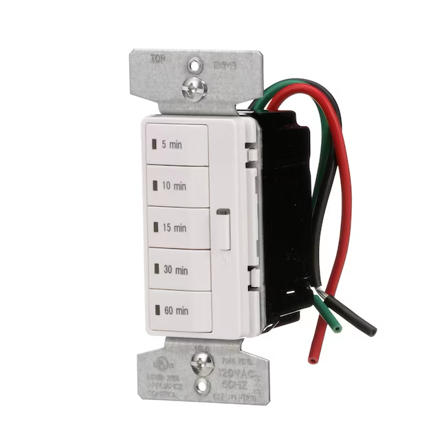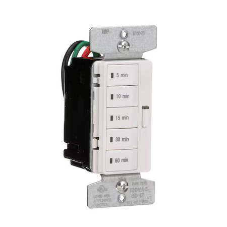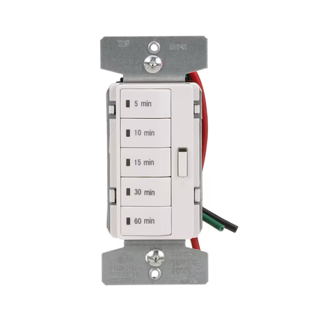 Five button minute timer offers 15A, 120V, 1800W capacity to easily control lights and fans with the touch of a button, while ensuring the device will not be left on