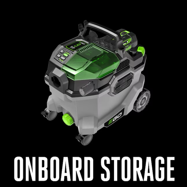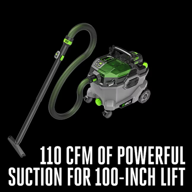 The EGO POWER+ 9 Gallon Wet/Dry Vacuum is the industry’s most powerful cordless wet/dry vac with a brushless motor that delivers 110CFM of powerful suction for 100-inch lift. Plentiful onboard storage conveniently stows nozzles, extensions, and hose for easy organization of your shop vac accessories. A filter cleaning function keeps the filter clean for maximum suction and efficiency when filling its 9-gallon tank. This cordless shop vac features multiple power modes including Low, High, and Turbo, which can be controlled onboard or via an included wireless remote. It runs up to 60 minutes on ECO, 30 minutes on high, or 20 minutes on turbo with the included 56V 5.0Ah ARC Lithium™ battery. It includes two extension tubes, a crevice nozzle, round brush dust nozzle, large floor nozzle and brush bar, rubber bar, compact floor nozzle, and a 1-7/8-inch hose. Clean with Power Beyond Belief™ with the POWER+ 9 Gallon Wet/Dry Vacuum Cleaner.