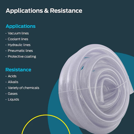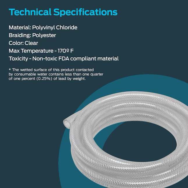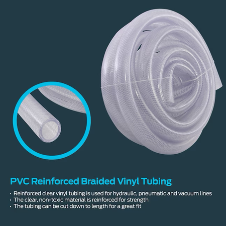 The EZ-FLO Braided Vinyl Tubing can be used in a wide variety of settings involving hydraulic, pneumatic, and vacuum lines. The clear, non-toxic material is reinforced for strength. Some commonly approved applications include: food and beverage lines, vacuum, coolant, hydraulic, and pneumatic lines. Resistant to acids, alkalis, a variety of chemicals, gases, and liquids. The tubing can be cut to size as needed. FDA compliant. Can be used in potable water applications.