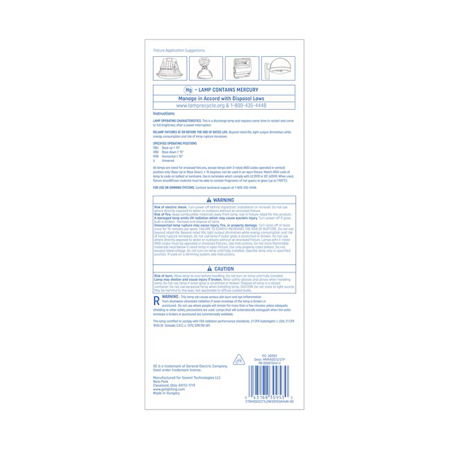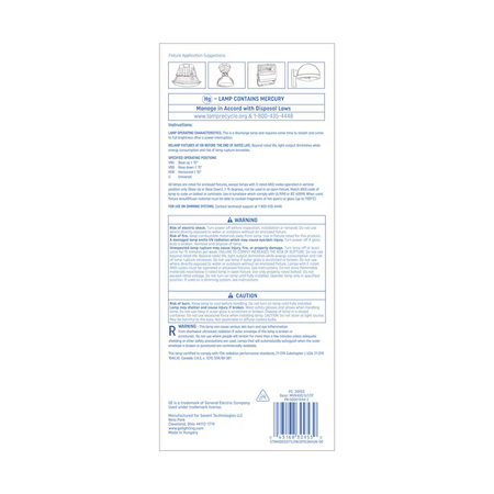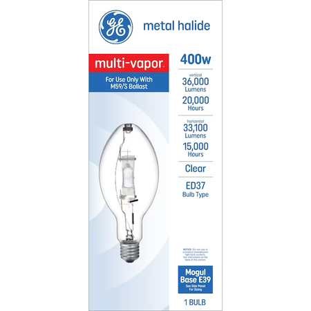 GE's Multi Vapor metal halide high intensity discharge light bulbs provide long-lasting performance and good efficacy. The sparkling white light provides very good color rendition versus GE's Mercury Vapor high intensity discharge light bulbs. These HID light bulbs and rated to last 20,000 hours in vertical applications and 15,000 in horizontal applications. Use this 400-Watt Multi Vapor ED37 shape light bulb only with M59/S ballasts in downlighting, corridors, lobbies and walkways in retail, commercial and industrial applications.