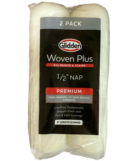 Expertly apply paint with the Glidden Woven Plus Roller Cover. With a 1/2" nap and 9" width, this premium cover ensures smooth and efficient coverage for your painting needs. Comes in a convenient 2-pack for extended use. Perfect for achieving a professional finish every time.