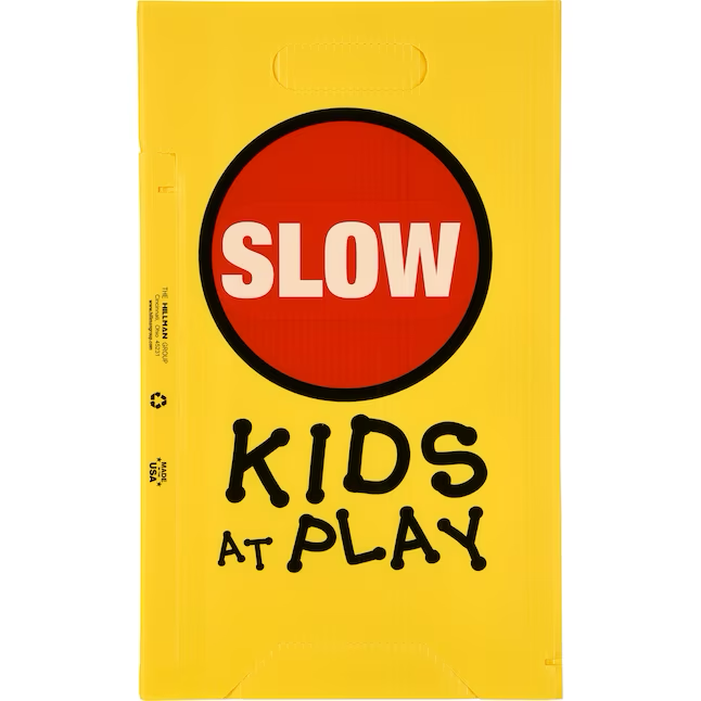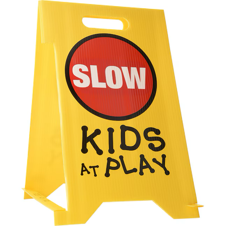 This Kids At Play sign increases safety by letting drivers know that children could be in the street. Its tent design allows for easy set up and tear down. Features bright, highly visible colors.