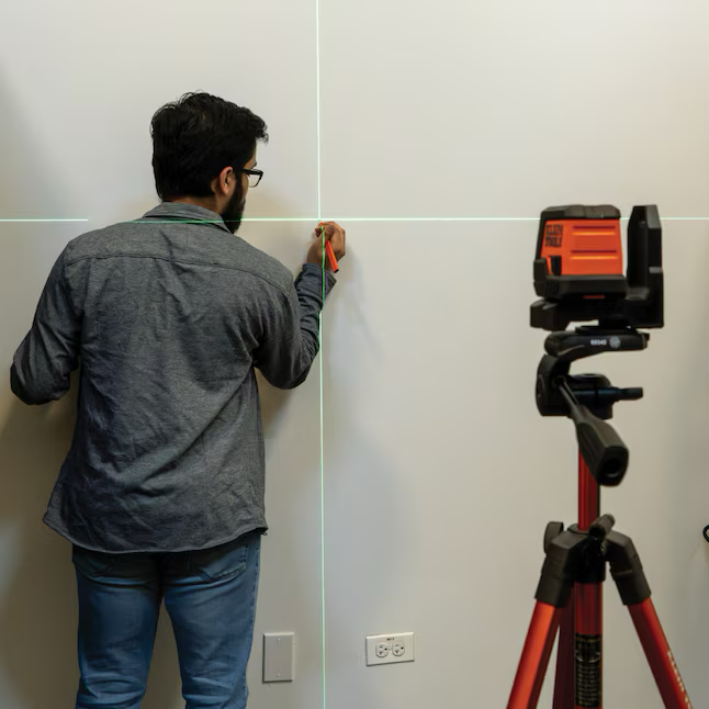 Self-Leveling Green Laser Level has easy-to-read, horizontal and vertical lines, optimized for indoor lighting conditions with a working range of 50 feet (15.2 m)