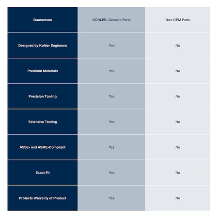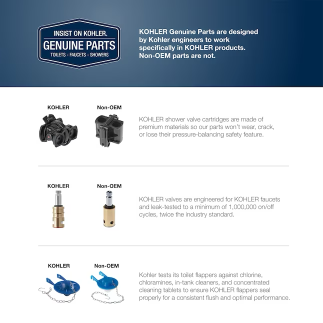 Protect the warranty on Kohler products, always look for the Kohler GENUINE Parts logo. Kohler GENUINE Parts are designed by Kohler engineers to maintain original product performance and promote product longevity.