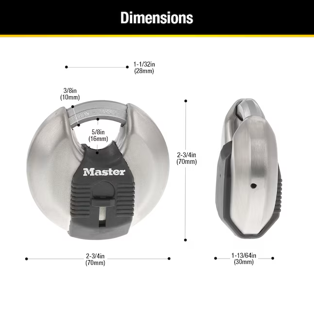 2-3/4 in (70 mm) wide lock body; 3/8 in (10 mm) diameter shackle with 5/8 in (16 mm) length, 1-1/32 in (28 mm) width