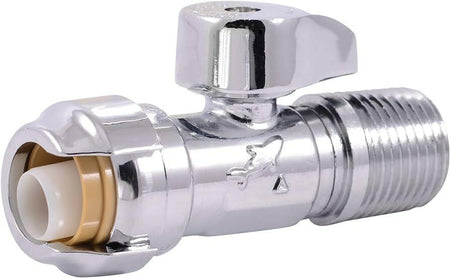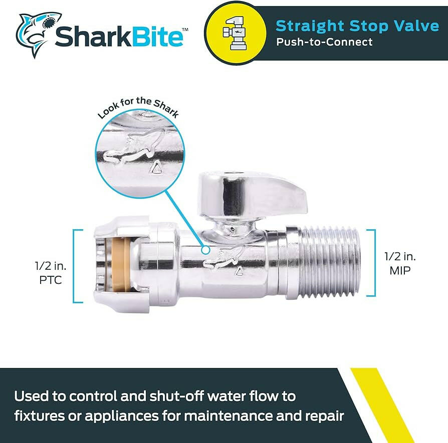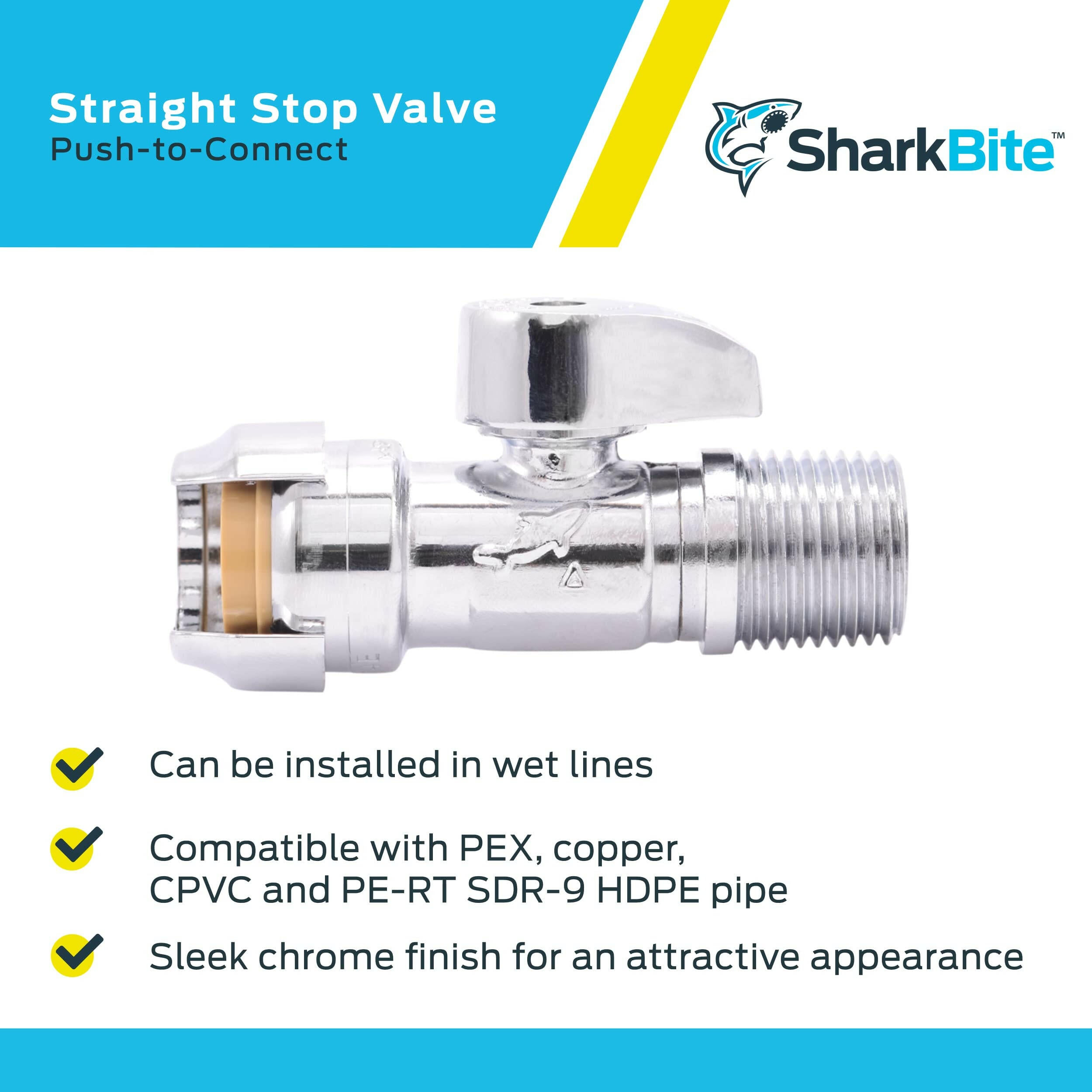 The SharkBite 1/2 in. Push-to-Connect x 1/2 in. Male Pipe Thread Quarter-Turn Straight Stop Valve controls water flow to household plumbing fixtures. The Straight Stop Valve is used where the water pipe enters the room to allow for easy shut-off of water flow to the end fixture allowing for maintenance and repair without having to turn water off to the entire home. The SharkBite push-fit end allows you to simply push on to Copper, CPVC or PEX with no solder, clamps, unions or glue. Just insert the pipe and the stainless steel teeth bite down and grip tight, while a specially formulated O-ring compresses to create a perfect seal. Disassembly is just as fast using the simple disconnect tool so fittings and valves can be easily changed and reused. They can even be rotated after assembly for easier installation in tight spaces.