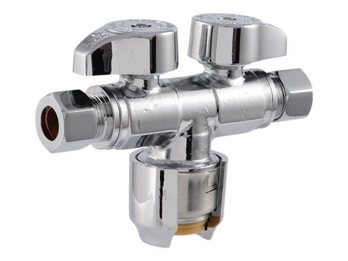 SharkBite Max dual outlet stop valves are used to control and shut off water flow to fixtures and appliances for maintenance and repair.