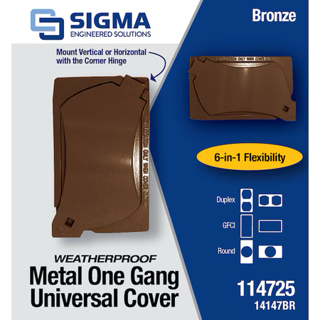 Sigma's weatherproof one-gang universal covers provide protection to outdoor receptacles mounted vertically or horizontally. They are configurable for GFCI, duplex and round devices. Their die-cast construction features a self-closing lid to prevent moisture penetration when receptacles are not in use. The cover is lockable to restrict unwanted access and compliment weatherproof one-gang boxes installed in wet, damp or dry locations. Covers include hardware, gasket and adapter plates for various configurations.
