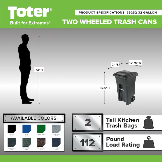 • Constructed using Toter's Advanced Rotational Molding, our trash cans are built for toughness and maximum impact resistance