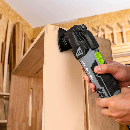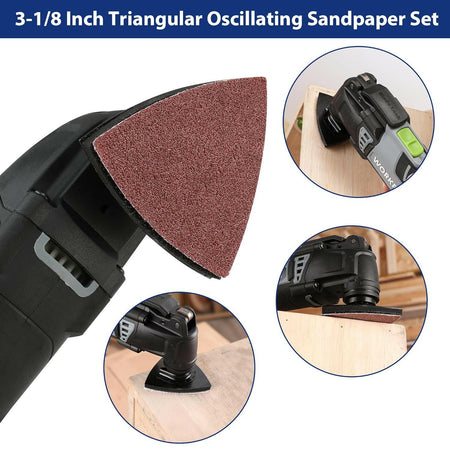 The size of WORKPRO triangle sanding pads is 3-1/8 x 3-1/8 x 3-1/8 in, compatible with 3-1/8 inch oscillating multi-tool. Due to the unique design, they can help you sand the edges and corners of various kinds of wood.