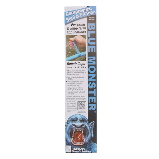 Blue Monster compression seal tape stops problem leaks under pressure without having to turn off the water source. Self fusing layers form a waterproof compression seal. Rated to hold 150 PSI leaks and works on all types of rigid piping.