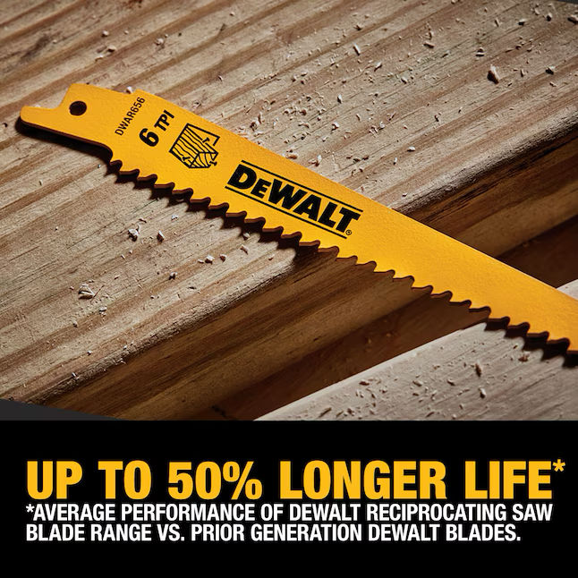 • Up to 50% Longer Life Average performance of DEWALT reciprocating saw blade range vs. prior generation DEWALT blades