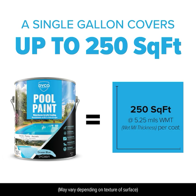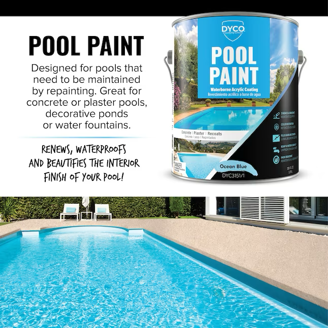 SWIMMING POOL PAINT: Get a beautiful tile-like finish on your concrete, plaster, or masonry surfaces with Dyco Waterborne Acrylic Ocean Blue Pool Paint.