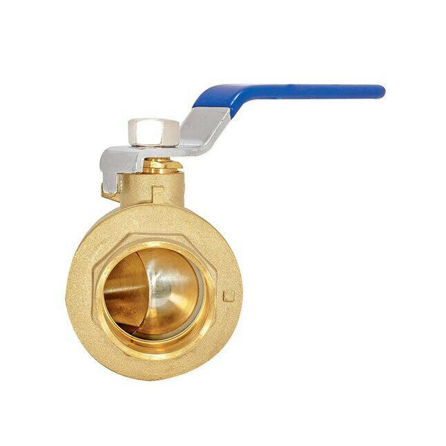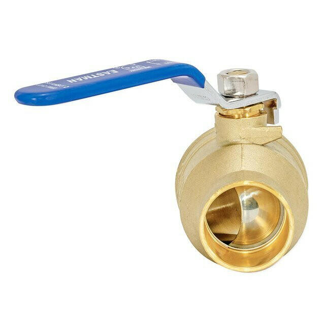 This Eastman® ball valve is a full port valve configured for a 1-1/2-inch sweat connection. This valve is built with heavy-duty brass for durability and strength. Its full port design allows for maximum flow and minimum pressure drops. It is equipped with a vinyl-coated steel lever handle, enabling an easy grip for flow control.