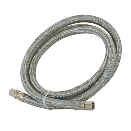 The Eastman® braided stainless steel icemaker connector is the standard in water supply lines. The supply line features a non-toxic PVC core, a multi-filament braided nylon reinforcement, a clear vinyl outer shell with a grade 304 Stainless Steel braided exterior that is designed to prevent kinking and crimping. This flexible supply line resists corrosion and is easy to install.