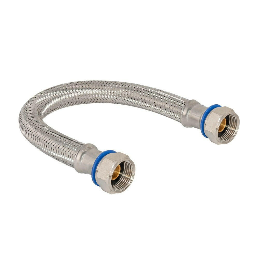 The Eastman water heater connector features a 3/4-inch female iron pipe inlet and a 3/4-inch female iron pipe swivel outlet. This high-quality water heater hose is built of a non-toxic plc. core, a multi-filament braided nylon reinforcement, a clear vinyl outer shell and a grade 304 stainless steel braided exterior that is designed to prevent kinking and crimping. This long-lasting water heater connector has a length of 24-inches. The flexible stainless steel braid allows for easy installation in tight spaces. It is UPC approved and complies with Lead-Free guidelines.
