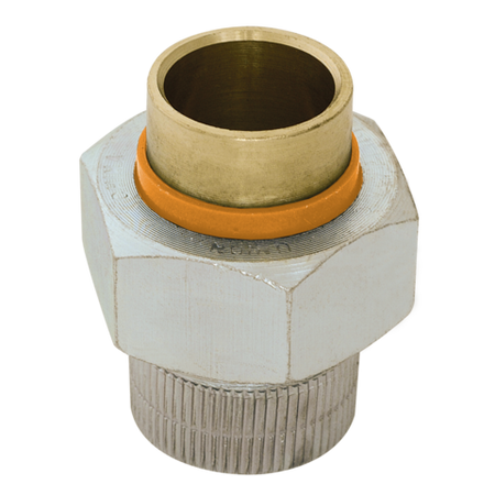 The Eastman® dielectric union is built of galvanized steel for increased durability with a steel end and a brass end for soldering. Dielectric unions are used to join pipes made from different metals to prevent accelerated corrosion in the piping system. This fitting is utilized to transition between steel and copper piping with a maximum operating pressure of 250 psi and 180-degrees Fahrenheit. The gasket is made with silicone rubber and a nylon insert. Meets plumbing code requirements.