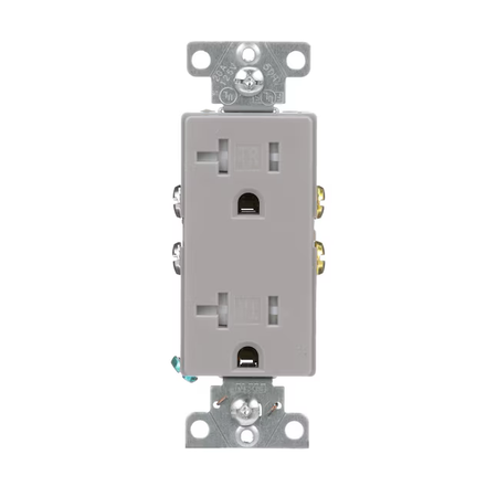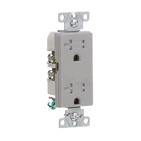 Gray finish commercial grade decorator duplex receptacle offers 20A, 125V capacity designed to provide a dependable, long lasting user experience while increasing speed and efficiency of installation