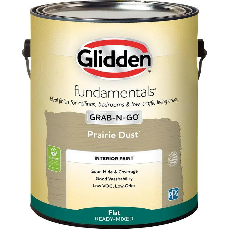 Glidden® Fundamentals Interior Paint, Prairie Dust, Flat, 1 Gallon is a low-VOC, low-odor liquid paint that provides good hide, coverage, and washability. Recommended for use on properly prepared concrete/masonry, metal, drywall, plaster, and wood. Select the best sheen for your project. Flat is an ideal finish for ceilings, bedrooms and low traffic living areas. Eggshell is an ideal finish for walls in all living areas including kitchen, bathroom and living room. Semi-gloss is an ideal finish for trim and interior doors.