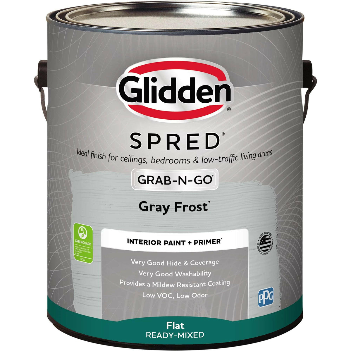 Glidden® Spred Interior Paint, Gray Frost, Flat, 1 Gallon is a low-VOC, low-odor liquid paint and primer* all-in-one that provides very good hide, coverage, and washability. Recommended for use on properly prepared concrete/masonry, metal, drywall, plaster, and wood. Select the best sheen for your project. Flat is an ideal finish for ceilings, bedrooms and low traffic living areas. Eggshell is an ideal finish for walls in all living areas including kitchen, bathroom and living room. Semi-gloss is an ideal finish for trim and interior doors.
