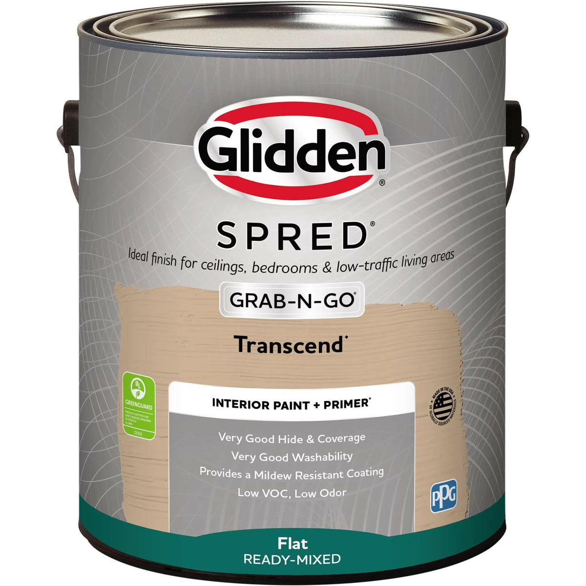 Glidden® Spred Interior Paint, Transcend, Flat, 1 Gallon is a low-VOC, low-odor liquid paint and primer* all-in-one that provides very good hide, coverage, and washability. Recommended for use on properly prepared concrete/masonry, metal, drywall, plaster, and wood. Select the best sheen for your project. Flat is an ideal finish for ceilings, bedrooms and low traffic living areas. Eggshell is an ideal finish for walls in all living areas including kitchen, bathroom and living room. Semi-gloss is an ideal finish for trim and interior doors.