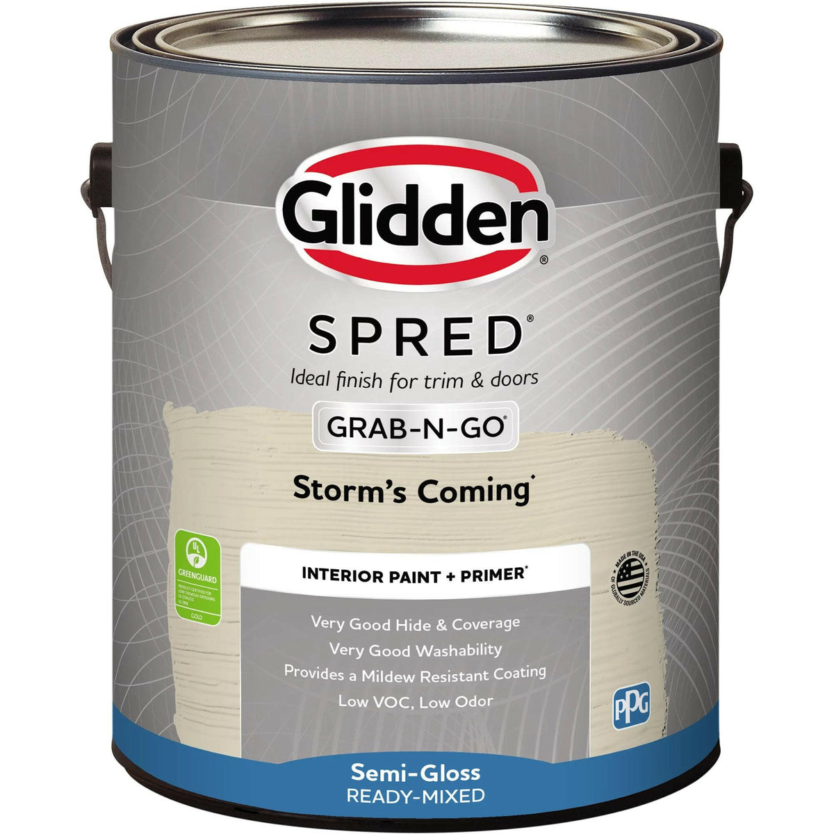 Glidden® Spred Interior Paint, Storm's Coming, Semi-Gloss, 1 Gallon is a low-VOC, low-odor liquid paint and primer* all-in-one that provides very good hide, coverage, and washability. Recommended for use on properly prepared concrete/masonry, metal, drywall, plaster, and wood. Select the best sheen for your project. Flat is an ideal finish for ceilings, bedrooms and low traffic living areas. Eggshell is an ideal finish for walls in all living areas including kitchen, bathroom and living room. Semi-gloss is an ideal finish for trim and interior doors.