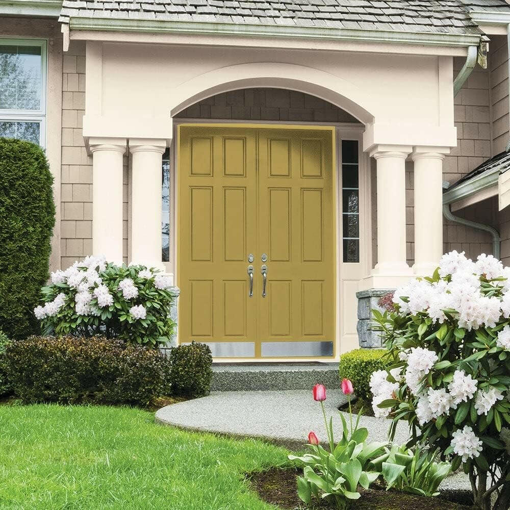 Obsession is a dark, subdued, camo yellow with an olive undertone. It is a perfect paint color for a dining room. Pair it with plums, greens and reds.